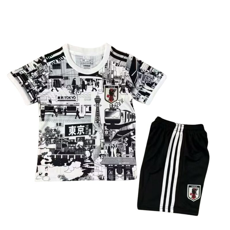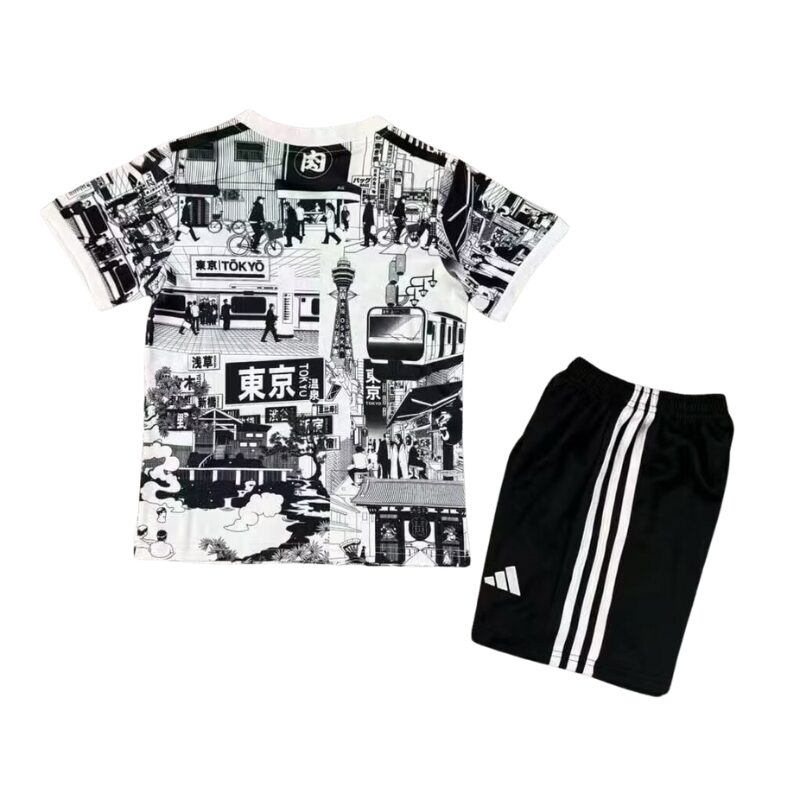 Plongez dans l’effervescence de Tokyo avec le Kit Enfant Concept Tokyo Blanc & Noir. Ce kit édition spéciale présente un design artistique unique en noir et blanc célébrant la capitale japonaise. Le maillot blanc arbore un collage manga illustrant les icônes de Tokyo : la Tokyo Tower, les rues animées, les trains, les temples traditionnels, et les enseignes lumineuses avec kanji japonais (東京). Ce style graphique de type manga urbain capture l’énergie vibrante de la métropole. L’écusson de la Fédération Japonaise de Football trône sur la poitrine. Le col blanc avec bandes noires aux épaules ajoute une touche moderne tandis que le short noir avec bandes blanches et écusson JFA complète l’ensemble. Conçu avec des matériaux respirants et légers, ce kit allie confort et performance. Parfait pour les jeunes fans de culture japonaise, les collectionneurs ou comme cadeau unique pour les enfants passionnés par Tokyo et le football japonais.